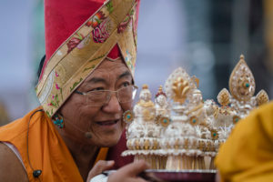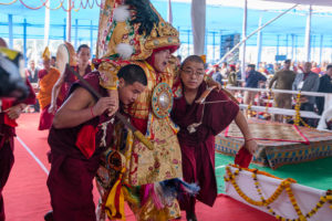 A significant ritual ceremony in unison with the heads of the Tibetan Buddhist traditions and the Sikyong (Premier of CTA) were thus summoned in the presence of His Holiness. Later H. H. Sakya Trizin Rinpoche lead the rites and offered the main mandala with an elaborate narration. The Oracle then blessed the public, which was appreciated by all present.